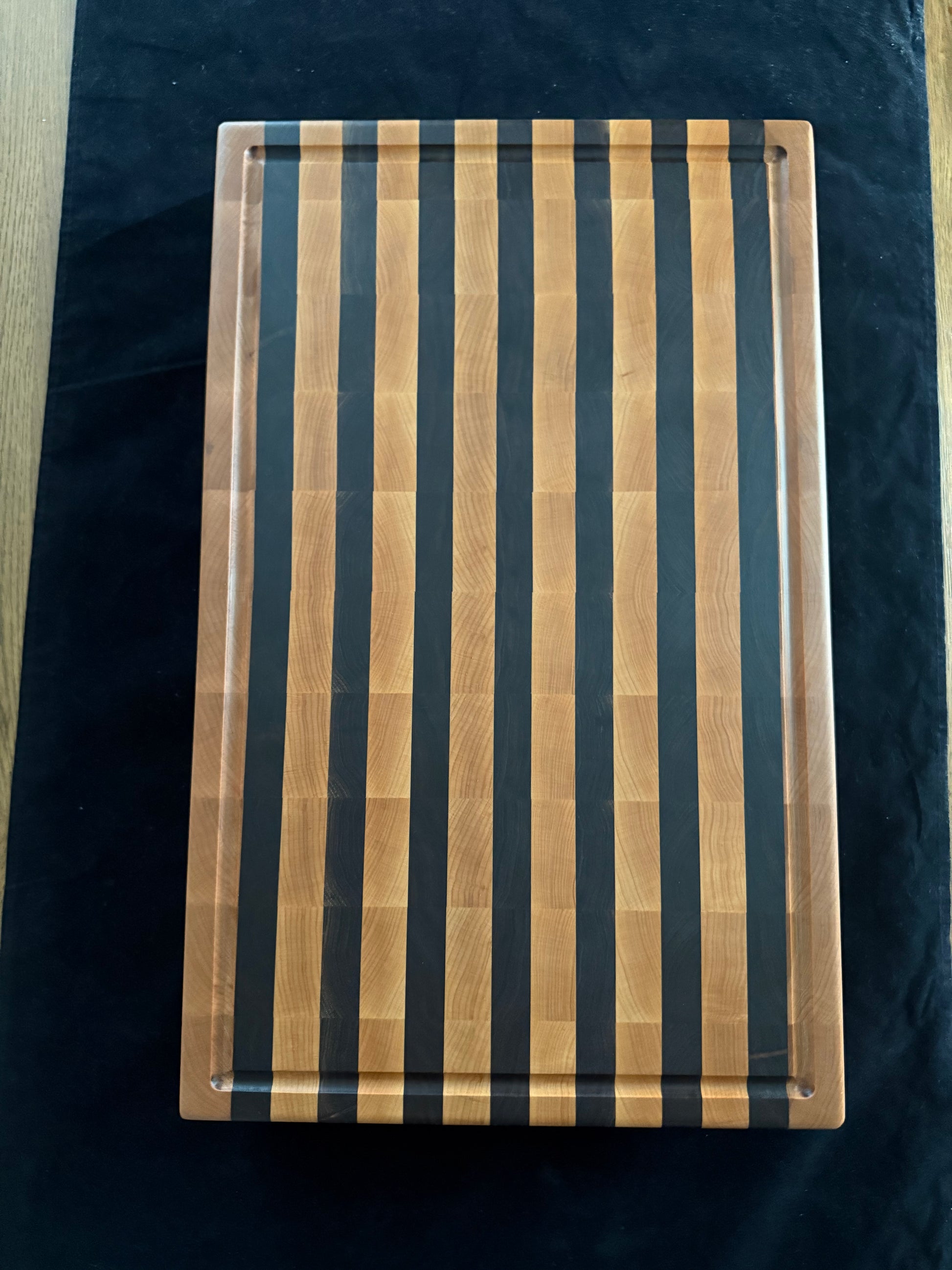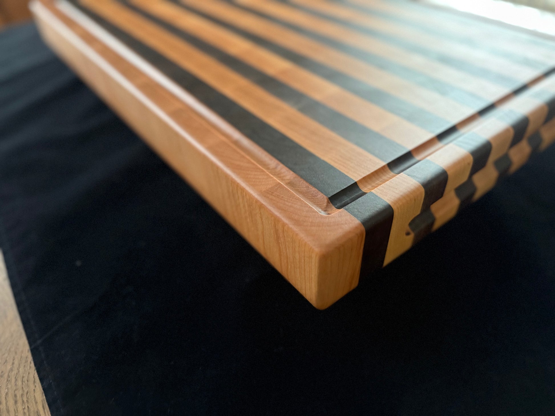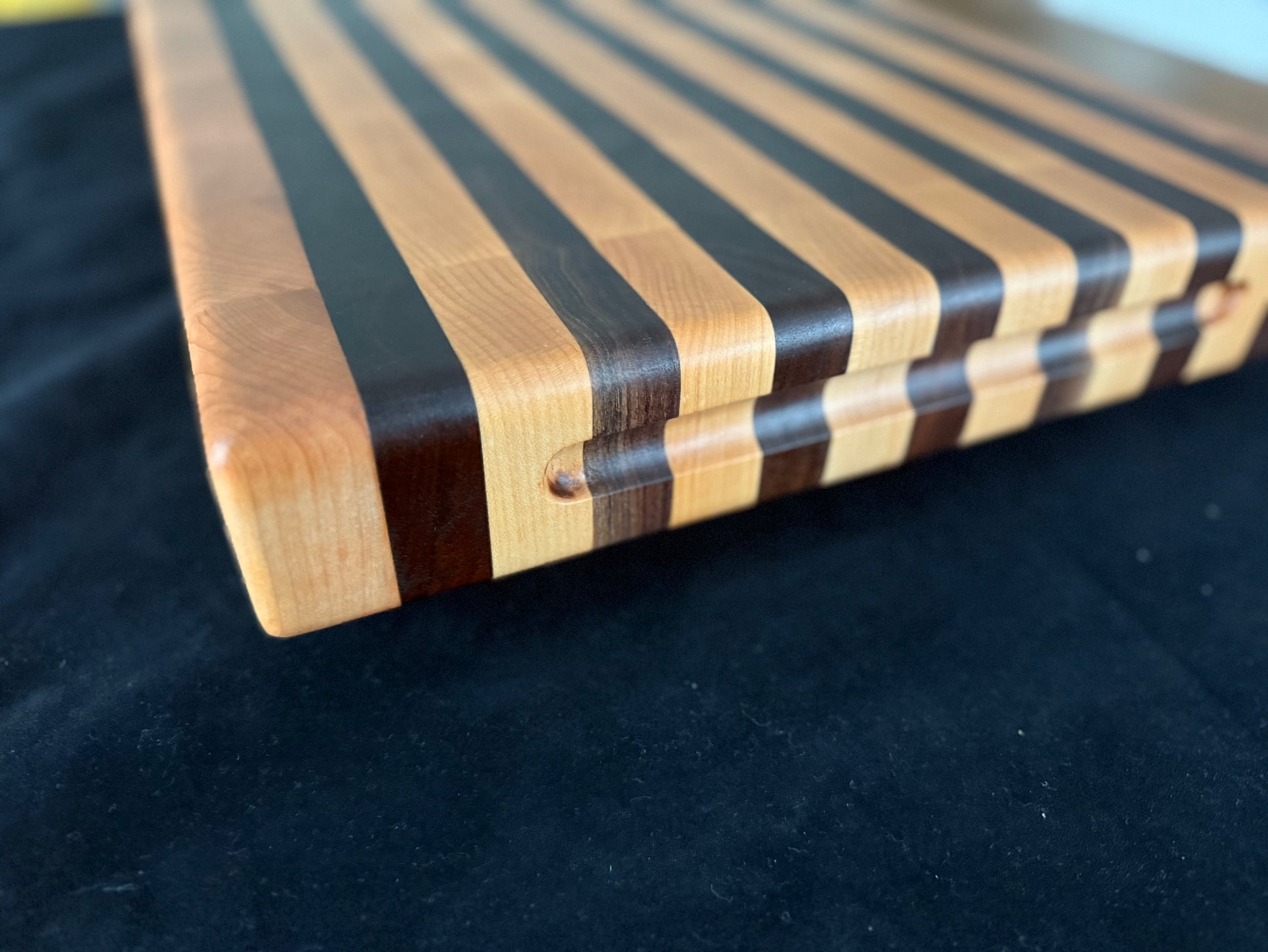 Example 2: Edge grain board Walnut, Brazilian Cherry, Maple, and Cherry with finger grooves 15"x24"x2 1/2" $300 pictures 6-8
