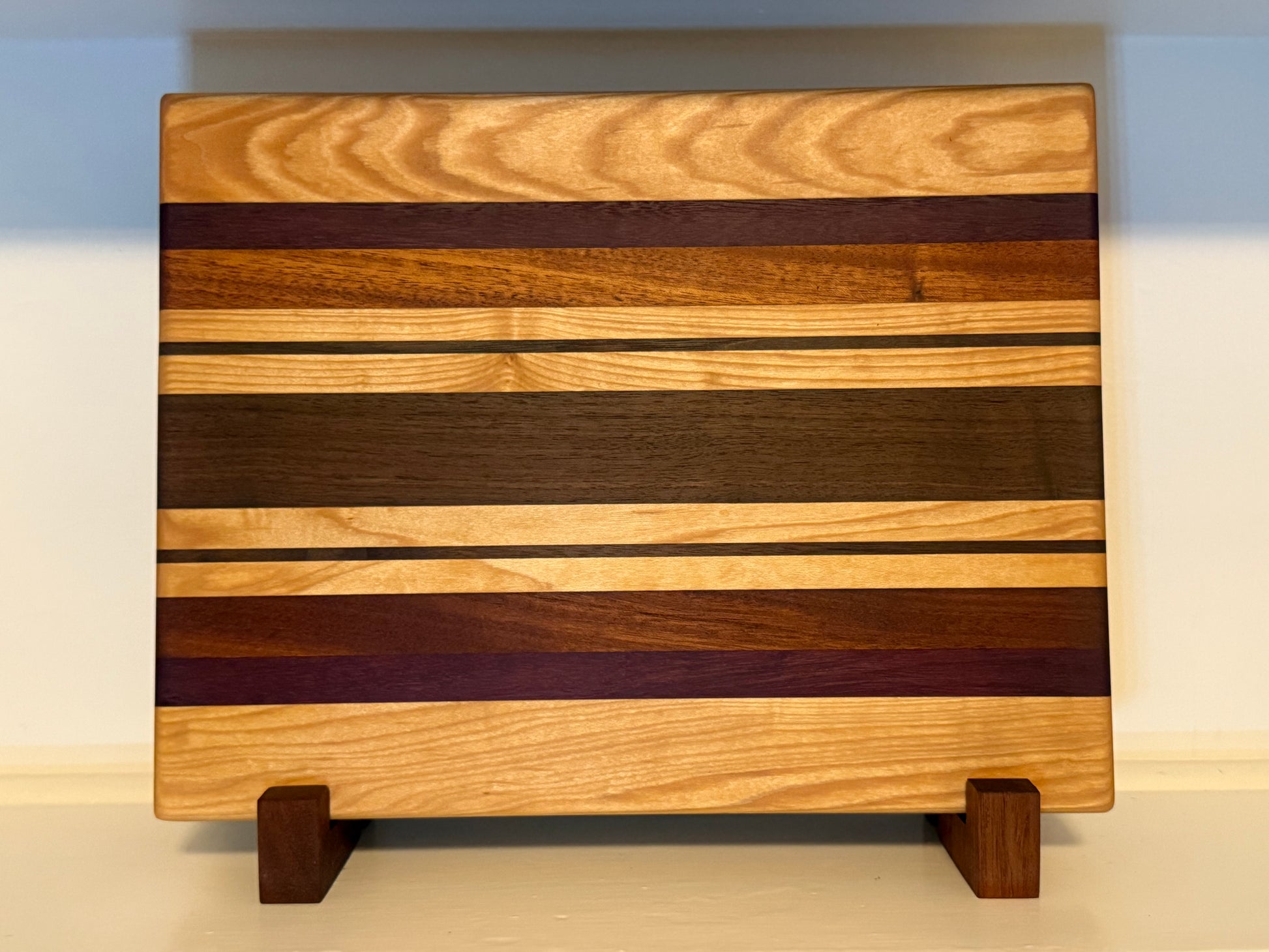 Each cutting board is uniquely crafted from meticulously selected hardwoods. We offer custom sizes, with pricing based on the type of wood and board dimensions. Choices include Walnut, Maple, Cherry, Purpleheart, Mahogany, Padauk, Brazilian Cherry, and more. Personalize your board with options such as a juice groove and feet to meet your specific requirements.